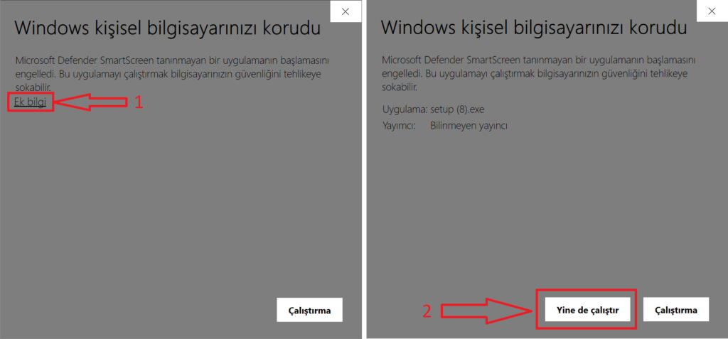 “Windows Kişisel Bilgisayarınızı Korudu” şeklinde bir uyarı ile karşılaşırsanız önce “Ek Bilgi” yazısına, ardından “Yine de Çalıştır” butonuna tıklayınz.(Aşağıdaki Görselde Gösterilmiştir.)
